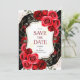 Boda de la exquisita flor Crimson Roses Rojas Salven las tarjetas de fecha infunde su invitación boda con encanto juguetón y deleite floral. Las rosales rojas crimson vibrantes se acompañan de extravagantes motivos florales que crean un diseño alegre y encantador. Editable para la personalización, usted puede fácilmente personalizar los detalles en línea para reflejar su estilo único y su historia de amor. Con la comodidad de una descarga digital instantánea, usted puede acceder rápidamente y distribuir a su personalizado guardar las fechas, lo que las convierte en una deliciosa introducción a su próxima celebración.