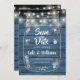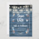 Cuenta con luces de cuerda sobre un tarro de masón artístico lleno de tu personalizado, ahorra detalles de fecha y delicadas flores dispersas en un fondo azul rústico de paneles de madera. Diseñado por Thisisnotme©