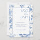 Esta refinada tarjeta azul y blanca "Save the Date" muestra un elegante borde floral inspirado en la tela y un centro minimalista y fresco para sus detalles bodas. La tipografía bellamente balanceada combina un guión elegante con letras clásicas del serif para un ambiente atemporal y romántico. Personalizable total con sus nombres, fecha de boda, ubicación y sitio web, este diseño es perfecto para presentar su celebración con estilo. Una elección ideal para los bodas tradicionales, del jardín o de la costa, lo que ofrece la impresión perfecta para su día especial.