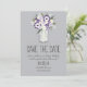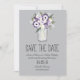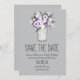 Elegante Mason Jar Salva el Anuncio de Fecha. Un Jar Mason lleno de flores de colores de Color claro y morado oscuro con flores silvestres de margarita blanca. Con un fondo gris plateado. Si el esquema de color no es lo que querías, por favor avísenme y lo recrear para ti, pero por favor contáctame antes de hacer un pedido. Correo electrónico paula@labellarue.com ¡Feliz planeamiento de Bodas! Asegúrate de escoger tu material de cartón favorito para imprimirlo.
