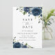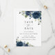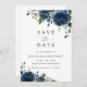 Invite a amigos y familiares con estilo y establezca el tono de su día especial con este encantador y ahorre la tarjeta de fecha. El diseño presenta flores color azul marino y vegetación sobre fondo blanco.