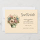 Tarjeta para guardar la fecha con una imagen adorable. Flores azules, rosadas y crema con hojas verdes. Puesta dentro de una maceta verde con un paño de cuadros verde colgando del borde.