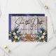 Este diseño tiene una elegancia rústica, manteniendo un tema simple. Fondo de madera de granero con cinta azul polvorienta, encaje, herraduras anudadas y ramos de flores silvestres con espacios para la fecha en la parte frontal. Espacio para una foto de la pareja en la parte trasera de la tarjeta con nombres, y texto "Gettin' Hitched" sobre un fondo de cinta a juego. Diseñado para coordinar con la colección "Gettin' Hitched - Horseshoes, Ribbon & Lace". Para cambiar detalles, haga clic en «Personalizar». Para mover el texto o cambiar el tamaño del texto, la fuente o el color, haga clic en «Haga clic para personalizar aún más».