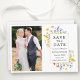 Moderno acuarela Boda de Flor silvestre Invitación de compromiso Save The Date Card incluye delicado amarillo, rosa, melocotón, azul polvoriento, verde salvia, violeta, rojo y naranja de flores silvestres, amapolas, hojas de eucalipto y otras hermosas plantas botánicas sobre un marco dorado. Foto de pareja.