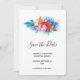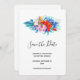 Fiesta salve la tarjeta de fecha con flores tropicales vibrantes y hermosas. Orquídeas, hibiscos y hojas tropicales. Color rosa, turquesa, rojo y naranja.