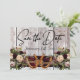 This design has a rustic elegance, keeping it simple theme. barnwood background with burgundy ribbon, knotted horseshoes and wildflower bouquets with placeholders for the date on the front. Placeholder for a photo of the couple is on the back of the card with names, and "Gettin' Hitched" script on matching ribbon background. Designed to coordinate with "Gettin' Hitched - Horseshoes, Ribbon & Lace" Collection. To change details, click «Personalize». To move the text or change the text size, font, or color click «Click to customize further»