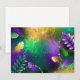 Fondo de mardi gris azul textural con manchas de color violeta, amarillo y verde, adornadas con plumas esponjosas y cuentas brillantes. Fiesta de Mardi gras.