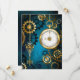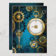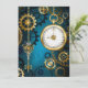 fondo turquesa, texturado, de vapor punk con bronce y oro, llave de plata y reloj. Estilo Steampunk.