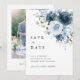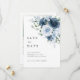 Una moderna y elegante tarjeta de "Save the Date" floral en azul polvoriento y azul marino que presenta un suave ramo de acuarela en la parte frontal y una foto completa en el reverso para tu foto de compromiso favorita.