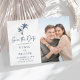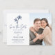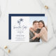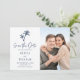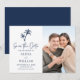 Esta elegante boda de playa tropical azul marino, salvo la tarjeta de fecha, tiene dos palmeras encima del texto, un elegante guión de escritura a mano para la invitación "Save the Date" y una foto de la feliz pareja.