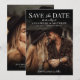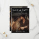 Tarjeta de aviso de boda oscura y elegante. Este diseño captura una estética refinada y sombría con fotos a página completa en la parte frontal y trasera. Un gradiente negro se superpone en la parte superior e inferior de la imagen frontal, destacando el texto blanco en una hermosa combinación de letra cursiva elegante y fuentes serif clásicas para un efecto audaz y sofisticado. "Save the Date" se coloca de manera prominente en la parte superior, seguido por los nombres de la pareja, la fecha de la boda, la ciudad y el estado, con "Invitación formal a seguir" sutilmente posicionado en la parte inferior.