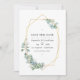 Invitación de foto de boda con marco geométrico dorado y eucalipto de bosque en acuarela plateada personalizable según los detalles de su evento. Ideal para cualquier tema o boda de jardín.
