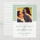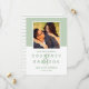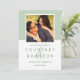 Bodas modernas, excepto las tarjetas de invitación de fecha, presentan una foto de compromiso cuadrado enmarcada en verde aloe / sabio con un sencillo y minimalista estilo monograma de los nombres de novias y novios con un elegante guión de letra. Personalice el texto de guardar la fecha con la fecha y ubicación del boda. La parte posterior de la tarjeta incluye un elegante patrón de rayas horizontales de foliage finas, verdes y blancas.