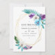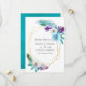 Salva la fecha de boda con hojas tropicales de acuarela turquesa y púrpura con marco geométrico dorado y tipografía elegante.