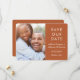 Un diseño moderno sencillo para anunciar la fecha de su boda presenta su foto favorita con una tipografía blanca clásica para todos sus detalles importantes. La parte delantera y trasera son terracota