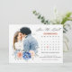 Tarjeta de anuncio de boda floral rosa y azul marino que incluye un ramo elegante de azul marino, azul real, blanco, rosa garden rose, hydrangea y hojas de eucalipto verde sage. Por favor, contácteme para cualquier ayuda en personalización o si necesita cualquier otro producto con este diseño.