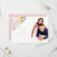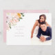 Tarjeta de foto de tarjeta de aviso de boda de acuarela floral de moda en tonos pastel de lila y rosa salmón con lirios, magnolias, rosa de jardín, peonías y follaje.