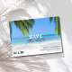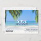 Fije el tono para su boda de ensueño en la playa con nuestra foto de la boda de destino de playa Salve la fecha. Con un impresionante diseño tropical de playa en la parte delantera con texto elegante, esta tarjeta captura perfectamente la esencia de una celebración costera. En la parte trasera se muestra una foto muy apreciada de la pareja, con un toque personal que dejará una impresión duradera a los clientes.