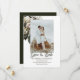 Bajo la foto de un fondo blanco, bajo la cual se ve a los clientes un inetéreo ramo de flores en tonos blancos de invierno y rosa polvoriento con vegetación de temporada, que invita a "Save the Date" para una ocasión boda rústica y memorable. El texto es de color verde oscuro. La parte trasera tiene un fondo verde oscuro. Simplemente agregue sus nombres y detalles del boda para completarlos. Diseño compuesto por Holiday Hearts Designs (derechos reservados).
