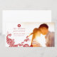 Diseño de pavo real bohemio elegante rojo y blanco con detalles florales y una cola hecha de formas de paisley, combinado con un símbolo chino de doble felicidad en un marco de círculo simple. Un diseño de boda temático asiático muy único, chic y clásico para la pareja moderna y elegante.