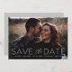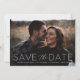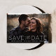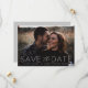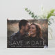 Una tarjeta de fecha moderna para guardar la foto de tu compromiso favorito con "Save the Date" en un simple superpuesto blanco complementado por un elegante guión de caligrafía. Personalice la parte delantera de la foto para guardar la tarjeta de fecha agregando sus nombres, fecha de boda y ubicación del boda. La tarjeta se revierte a un fondo gris con un patrón blanco moderno. Cambie el color del fondo a un color de su elección con nuestras herramientas de edición.