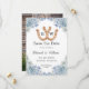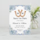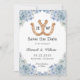 Un ahorro de fecha con flores azules en la parte superior e inferior con herraduras de color marrón entrelazadas. Añade las iniciales de la pareja e información del boda en la parte delantera. Añadir una foto al fondo así como información opcional del sitio web del boda. Perfecto para bodas rústicos, bodas al estilo granero y bodas al aire libre.