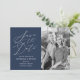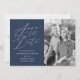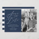 Elegante foto guardar las tarjetas de fecha con "Save the Date" mostradas en un guión de caligrafía blanca con fondo marino. Personalice la marina para guardar las fechas con su foto de compromiso vertical, nombres, fecha de boda y ubicación. La parte posterior de la tarjeta de fecha moderna guarda rayas blancas y navales.