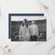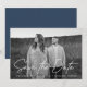 Simplemente guarde la tarjeta de fecha con su foto de compromiso horizontal con "Save the Date" en una sobreimpresión de script manuscrito blanco. Personalice la tarjeta de fecha moderna para guardar la tarjeta agregando sus nombres, fecha de boda y ubicación de boda. La foto guarda la fecha se invierte para mostrar su sitio web boda y otros detalles con letras blancas con un fondo azul marino.