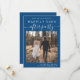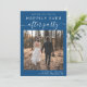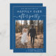 El azul clásico moderno salva el anuncio de fecha para su salida o la recepción de boda privada que incluye su foto y "Feliz eterno después del Fiesta" en una mezcla de tipografía blanca simple y un guión blanco de moda con toques. Bajo la foto, añada sus nombres y la fecha y ubicación de recepción/fiesta.