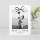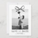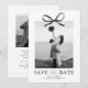 Anuncie su próxima celebración con estilo atemporal con estas modernas tarjetas de save the date de boda. Diseñadas con un fondo blanco crujiente, el frente presenta un impresionante centro de foto acentuado por un lazo clásico de acuarela negra, que agrega un toque de romance y sofisticación.