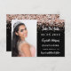 Añadir una foto de tamaño vertical. Color de fondo negro, decorado con purpurinas de imitación de oro rosa, chispas. Personalice y agregue un nombre y los detalles.