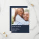 Un diseño moderno sencillo para anunciar la fecha de su boda que incluye una de sus fotos favoritas con una tipografía blanca clásica para todos sus detalles importantes. La parte frontal y trasera son de un azul profundo.