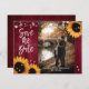 Boda rústica de borgoñas y girasoles salva la tarjeta de foto de fecha con girasoles en un fondo de madera de granero adornado con luces de cuerda. Diseño de tarjetas ideal para un campo rústico, jardín, patio trasero o fiesta de bodas de granero inspirado en flores de girasol.