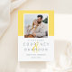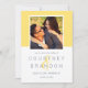 Bodas modernas, excepto las tarjetas de invitación de fecha, incluyen una foto de compromiso cuadrado enmarcada en amarillo marrón con un sencillo y minimalista estilo monograma de los nombres de novias y novios con un elegante guión. Personalice el texto de guardar la fecha con la fecha y ubicación del boda. La parte posterior de la tarjeta incluye un elegante patrón de rayas horizontales de pizarra delgada azul gris y blanco.