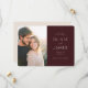 Esta tarjeta de anuncio de boda presenta un diseño dividido con una foto cálida y espontánea a la izquierda y texto elegante a la derecha. La paleta de colores combina amarillos y marrones suaves de la fotografía con un fondo burdeos rico para la sección de texto, creando una mezcla armoniosa de intimidad casual y elegancia formal. La tipografía es limpia y sofisticada, con espacios personalizables para nombres, fechas y ubicaciones, lo que garantiza la personalización y mantiene un aspecto pulido. Perfecta para establecer el tono para un evento memorable, este diseño captura tanto el estado de ánimo alegre como la anticipación de una celebración especial.