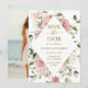 Rosas muy bonitas de color rosa polvoriento crean un marco para rodear los detalles de su anuncio de fecha de salvación. El texto dorado añade al ambiente glamoroso.