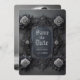 Anuncie sus planes bodas con estilo con esta temática gótica salve la tarjeta plana de fecha con rosas blancas en un marco gris de lujo y sus nombres, fecha boda y foto en la parte posterior para personalizar. Diseñado por Susan Coffey. Imágenes generadas con IA.