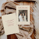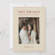 Este anuncio de la moda Save the Date presenta un libro de cocina moderno como el ambiente. El frente minimalista tiene una foto, un texto serif clásico y un fondo beige cremoso. La parte posterior de la invitación tiene espacio para guardar formalmente el mensaje de fecha.