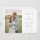 Esta tarjeta de anuncio de boda presenta un diseño moderno y minimalista con una distribución equilibrada, dividida en dos secciones. El lado izquierdo muestra una foto suave y soñadora de una pareja abrazándose en un campo, mientras que el lado derecho presenta texto elegante y centrado sobre un fondo blanco limpio. La paleta de colores incluye verdes terrosos y blancos crujientes, creando una atmósfera serena y armoniosa. Con marcadores personalizables para nombres, fechas y ubicaciones, esta plantilla es perfecta para parejas que buscan anunciar su día especial con simplicidad y estilo.
