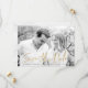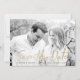 Moderno guarde la tarjeta de fecha con su foto de compromiso horizontal con "Save the Date" (Guardar la fecha) que se muestra en una sobreimpresión manuscrita de guión de oro falso. Personalice la parte delantera de la foto y guarde la fecha con sus nombres, fecha de boda y ubicación del boda. La tarjeta se revierte para mostrar un elegante diseño de mármol blanco y gris.