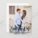 Utilice nuestra foto retrato para guardar las tarjetas de fecha con un guión moderno para que sus huéspedes sepan que no pueden usar su fecha de boda con antelación. Sugerencia: si necesita cambiar la redacción que está en el tipo de letra del guión, puede ir a la sección "Personalizar esta plantilla" y, a continuación, hacer clic en el botón "Hacer clic en el Personalizar para más adelante" situado en la parte inferior. Puede borrar cualquiera de las imágenes de texto que necesite y añadir su propio texto en su lugar con el botón "Añadir texto". No olvide consultar nuestra gran selección de fotos, guarde las tarjetas de fecha, postales e imanes navegando por nuestra colección de imágenes Guardar la fecha!