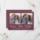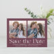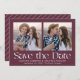 Sencilla y moderna, ahorra las tarjetas de fecha con dos de tus fotos favoritas en la parte delantera. "Save the Date" (Guardar la fecha) se muestra debajo en un tipo de letra blanco y moderno con un fondo morado. Personalice la parte delantera de la foto moderna para guardar la tarjeta de fecha añadiendo sus nombres, fecha de boda y ubicación del boda. El minimalista guarda la tarjeta de fecha se invierte para mostrar un diseño delgado de rayas diagonales blancas con un fondo morado o color de su elección.