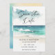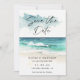 Moderna tarjeta de Save the Date con foto de playa y acuarela con un océano turquesa y una playa de arena blanca. La parte trasera de la tarjeta incluye una foto de la feliz pareja y un código QR que enlaza con el sitio web de la boda.