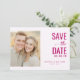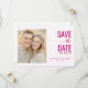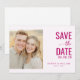 Esta tarjeta de guardar la fecha de la boda presenta un diseño dividido con una foto con enfoque suave de dos personas a la izquierda, colocada contra un fondo cálido al aire libre. El lado derecho muestra un texto magenta en negrita en una fuente moderna sans-serif, combinado con una elegante letra cursiva para los nombres, creando un ambiente alegre e invitador. El diseño equilibra la simplicidad y la sofisticación, utilizando el espacio negativo de manera efectiva para resaltar los detalles clave. Perfecta para parejas que buscan compartir su momento especial con amigos y familiares, esta tarjeta combina el estilo contemporáneo con toques personales.