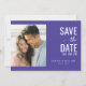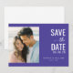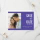Esta tarjeta de aviso de boda presenta un diseño moderno y minimalista con una distribución dividida. El lado izquierdo muestra un marcador de posición de foto con tema de playa, mientras que el lado derecho está lleno de un fondo azul-púrpura profundo que resalta la tipografía elegante. Una combinación de fuentes sans-serif en negrita y cursivas añade interés visual, creando un ambiente alegre e invitador perfecto para anunciar tu día especial. La paleta de colores armoniosa incluye tonos suaves azul-verdosos y melocotón apagados, lo que mejora el atractivo estético general.