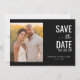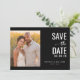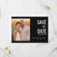 Esta tarjeta de guardar la fecha de la boda presenta un diseño dividido con una cálida y romántica foto de dos personas contra un fondo de flores amarillas en un lado y elementos de texto elegantes sobre un fondo negro sólido. La paleta de colores transita desde amarillos y naranjas suaves hasta negro profundo, creando una atmósfera íntima. La tipografía combina fuentes serif negritas para "GUARDAR LA FECHA" con letra cursiva para añadir un toque personal, mientras que el texto de marcador de posición personalizable permite una fácil personalización. La disposición general es equilibrada y centrada, enfatizando la claridad y la simplicidad, lo que la hace perfecta para ocasiones formales.
