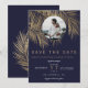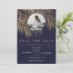 Moderna y simple palma dorada con tipografía sencilla, un tema de boda de guardar la fecha tropical y trendy en hoja de palma en azul marino. Agregue su foto de pareja