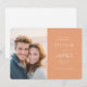 Esta tarjeta de anuncio de boda presenta un diseño dividido con una estética cálida y romántica. El lado izquierdo muestra una fotografía con enfoque suave de dos personas paradas muy juntas contra un sereno fondo de agua y cielo durante la puesta o salida del sol. A la derecha, una tipografía elegante sobre un fondo de color melocotón anuncia la próxima boda en una mezcla de fuentes serif y script, creando un aspecto atractivo y sofisticado. La composición equilibrada del diseño y la paleta de colores suaves transmiten una sensación de intimidad y celebración, lo que la hace perfecta para establecer el tono de un evento memorable.