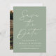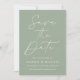 Anuncie a su próximo boda con estilo con esta moderna foto de estilo Sage Green estilo guión moderno ¡guarde la tarjeta de fecha! El diseño incluye "Save the Date" (Guardar la fecha) que se muestra en una caligrafía blanca de moda con un fondo verde sabio. Personalice el minimalista guardar la fecha con sus nombres, fecha de boda, ubicación y sitio web del boda. La fecha de guardar se invierte para mostrar la foto de compromiso vertical de sangrado completo. El verde sabio de la moda ahorra la fecha perfecta para los bodas modernos.