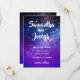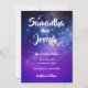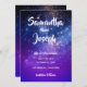 Fondo cósmico de imagen de espacio azul estrellado combinado con un brillante diseño azul violeta púrpura oscuro. Esta boda ahorra el diseño de la fecha tiene un estilo de escritura a mano cursiva moderna y todas las mayúsculas texto moderno. Cambia el estilo de letra, el tamaño o elige tu color favorito para crear tu propia boda personalizada, ahorra la invitación de fecha. También puedes crear una invitación totalmente única añadiendo tu propia foto detrás del sombrío. Paleta de colores violeta, azul oscuro, azul claro y blanco boda.